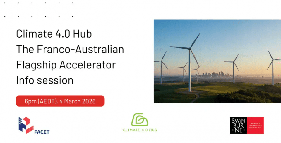 Le Climate 4.0 Hub, initiative lancée par FACET - Franco-Australian Indo Pacific centre for Energy Transition - lance un Programme d’Accélération Franco-Australien, opéré par Swinburne University et soutenu, entre autres, par le CEA, l’Université de Grenoble Alpes, l'Ambassade de France en Australie et le réseau French Tech Australia.